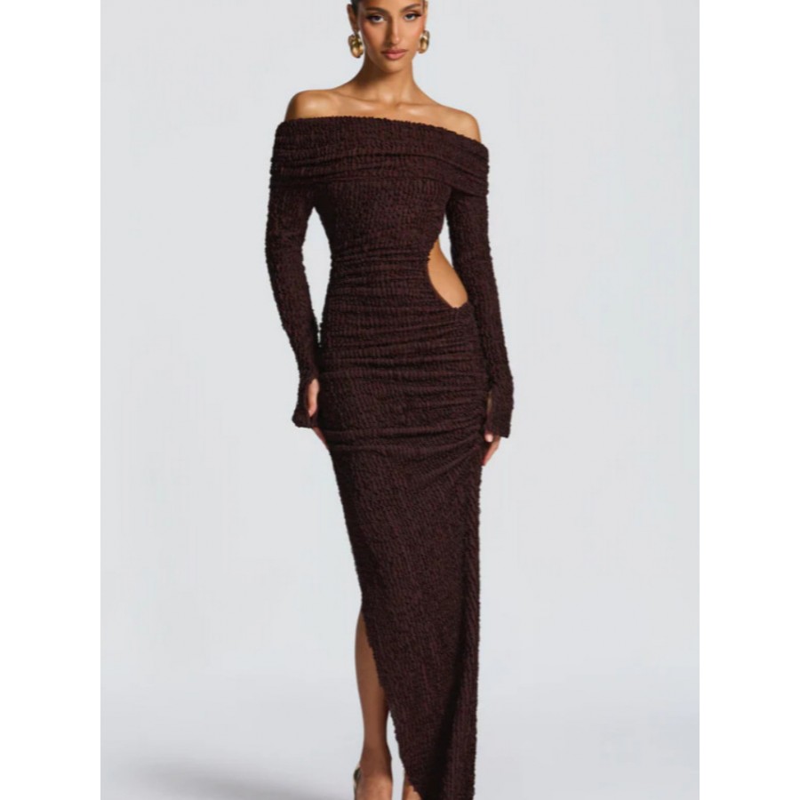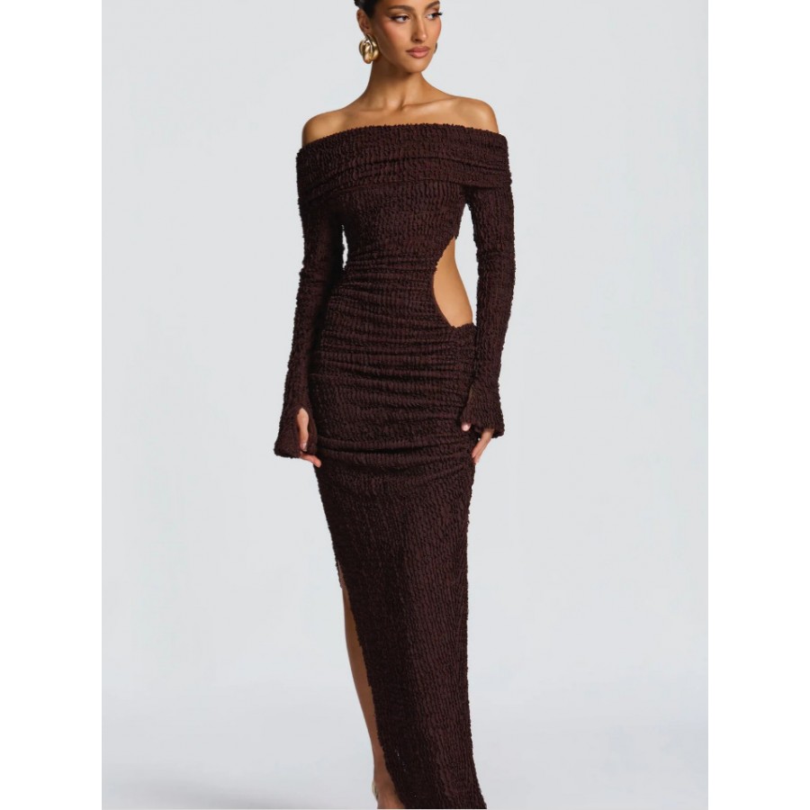 High-Slit Long-Sleeved Dress With A Slit Waist And Cutouts Coffee Brown