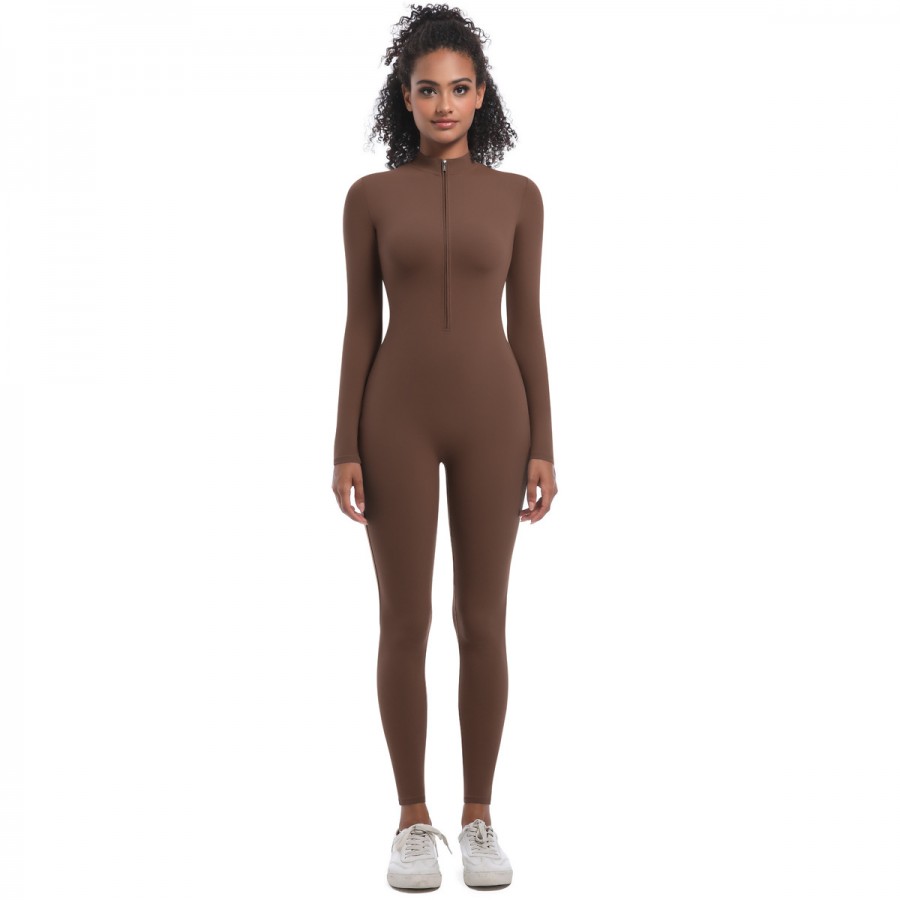 Solid Color Half-Open Zipper Tight-Fit Long Sports Bodysuit Brown