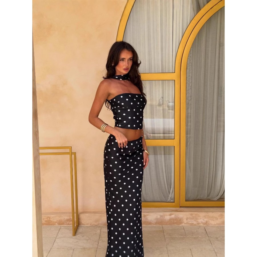 This chic two-piece set effortlessly blends playful charm with modern elegance. The cropped tube top features a classic polka dot print that adds a fun, retro-inspired touch, while the sleek black camisole skirt creates a flattering and versatile silhouette. Designed to be worn together or styled separately, this set highlights the waist and elongates the figure for a confident, feminine look. Perfect for casual outings, vacations, brunch dates, or summer parties, it pairs beautifully with sandals or heels for an effortlessly fashionable outfit.