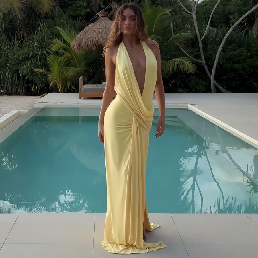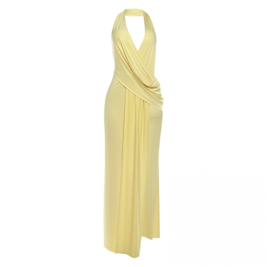 Women's Sexy Deep V-Neck Halter Neck Backless Slit Yellow Floor-Length Dress