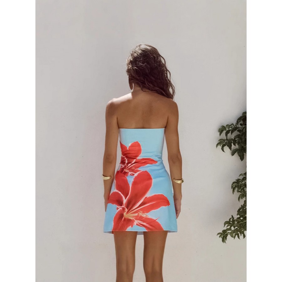 Women’s Strapless Floral Print Slim-Fit Bodycon Mini Dress Blue